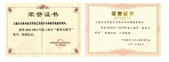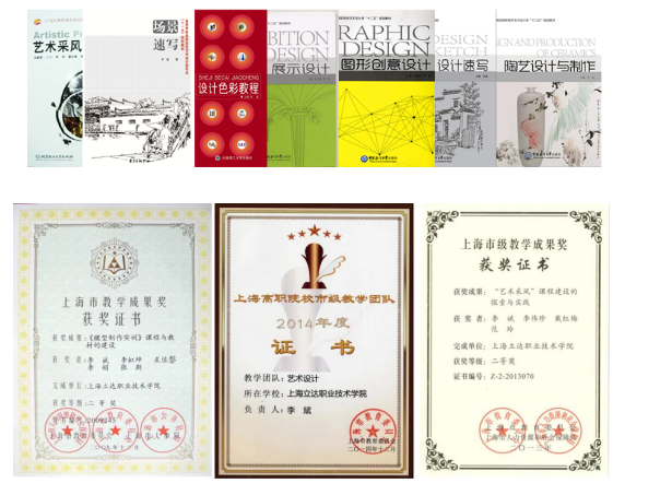 教育部高等公司高职高专艺术设计专业精品教材奖1项;出版国家规划教材13本;上海市优秀教学团队2支;上海市精品课程3门;上海市教学成果二等奖2项;连续两届被评为“上海市教育先锋号”。