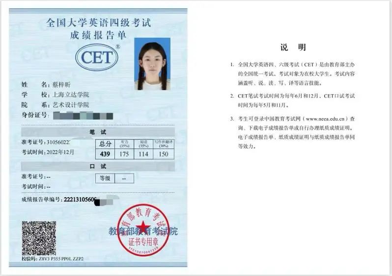 英语四级439分(2022年12月)