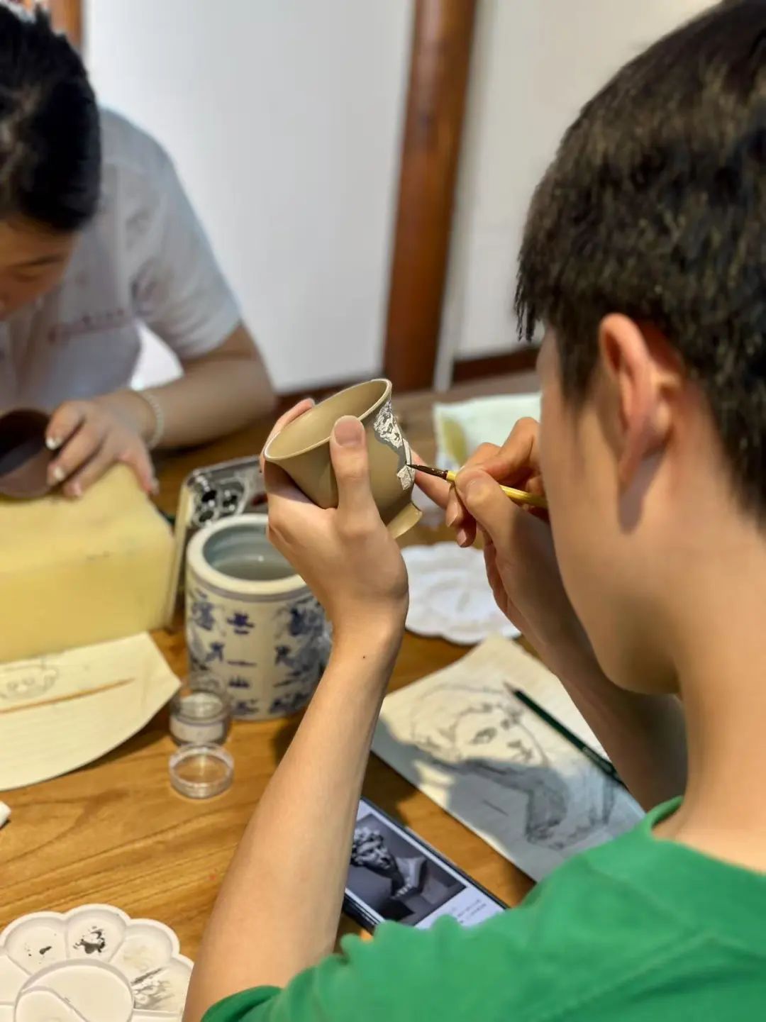 午后,团队成员围坐于工作台前,在匠人指导下尝试制作紫砂杯:揉泥时要感知泥土的“油性”,拉坯时需与旋转的轮盘形成默契,稍有不慎便前功尽弃。当亲手捏出的粗坯在阳光下泛着哑光,成员们更懂了:机械化生产可以复制外形,却复制不了手工里的温度与思考——这正是传统技艺在当代的不可替代性。