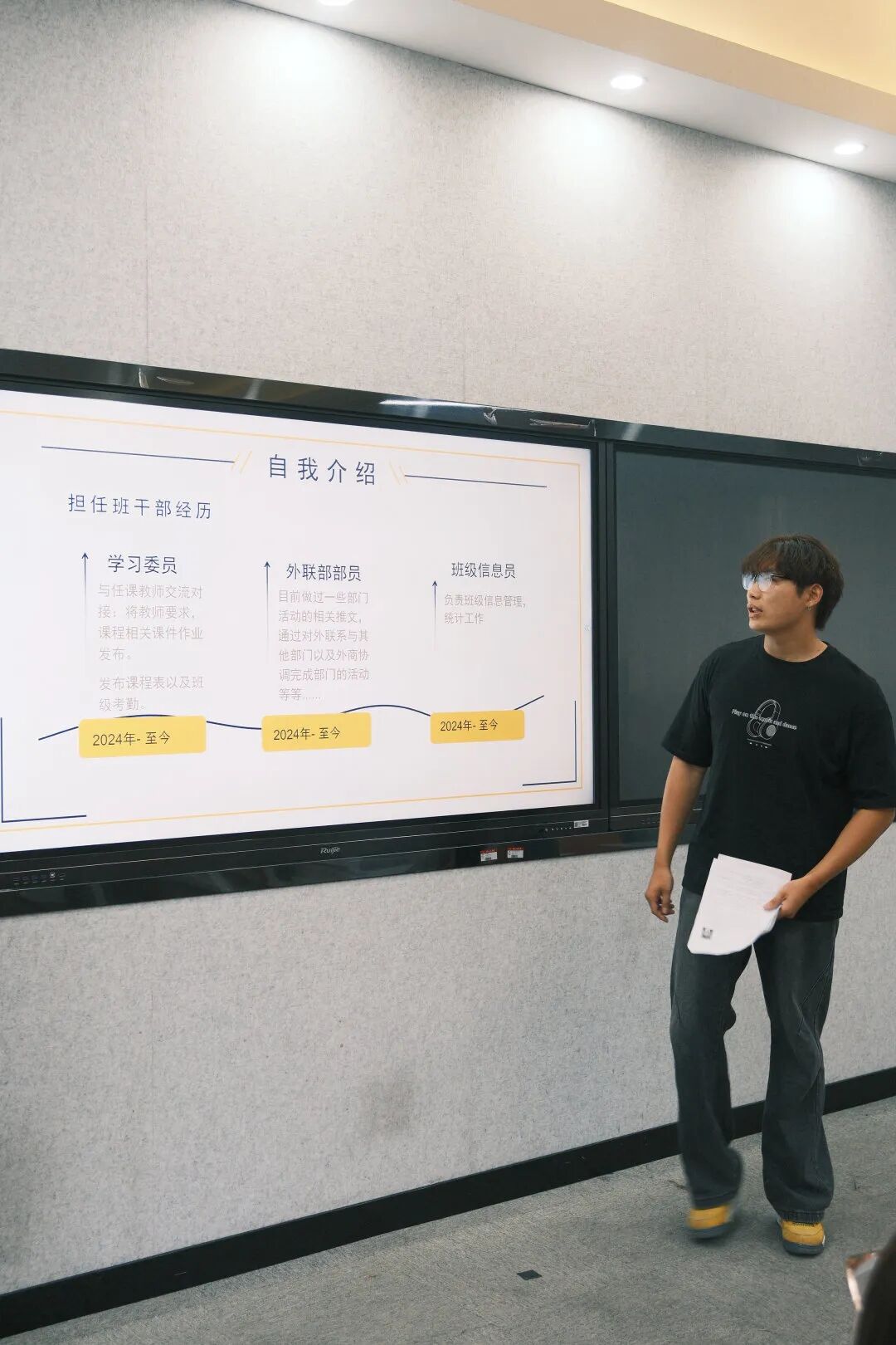在面试环节中,同学们从容地讲述自我介绍和竞选理由,言语间流露出强烈的责任感和愿为新生引路的决心。台下,辅导员老师认真倾听,不时点头记录,用鼓励的目光给予肯定。